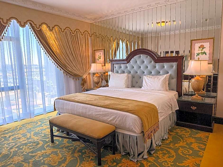 The 80 square yard Royal Suite features views of the city. It offers a king size bed, a seating area, marble bathroom fitted with a bath and shower, WiFi, 2 flat screen TVs', individually adjustable air-conditioning, a mini fridge, water heater, sofa bed, dining table, mini kitchen, 2 telephone extensions, a safe box and in-room bathrobe & slippers.